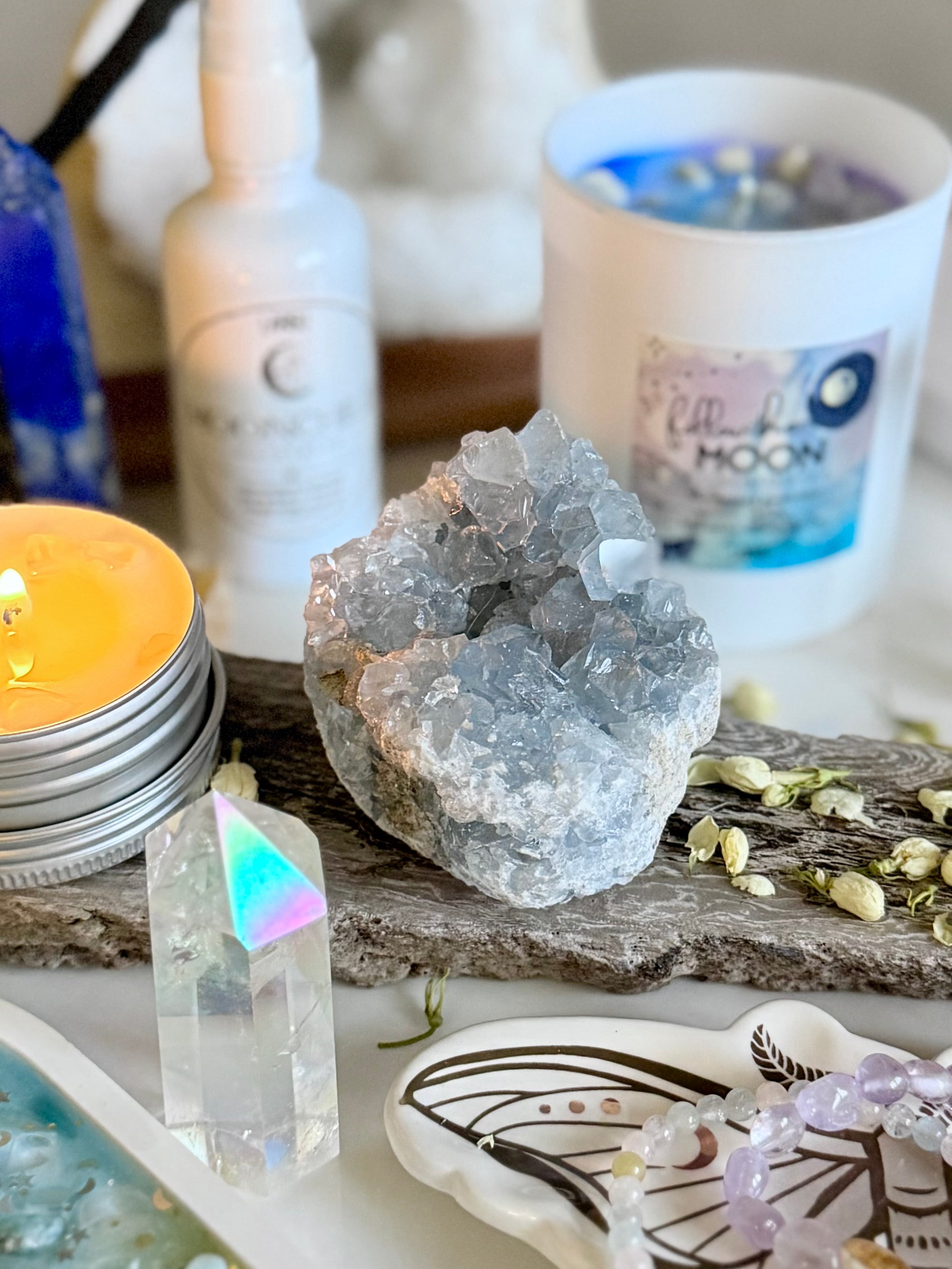 Kristallkerze „follow the moon“ mit Mondstein und Bergkristall