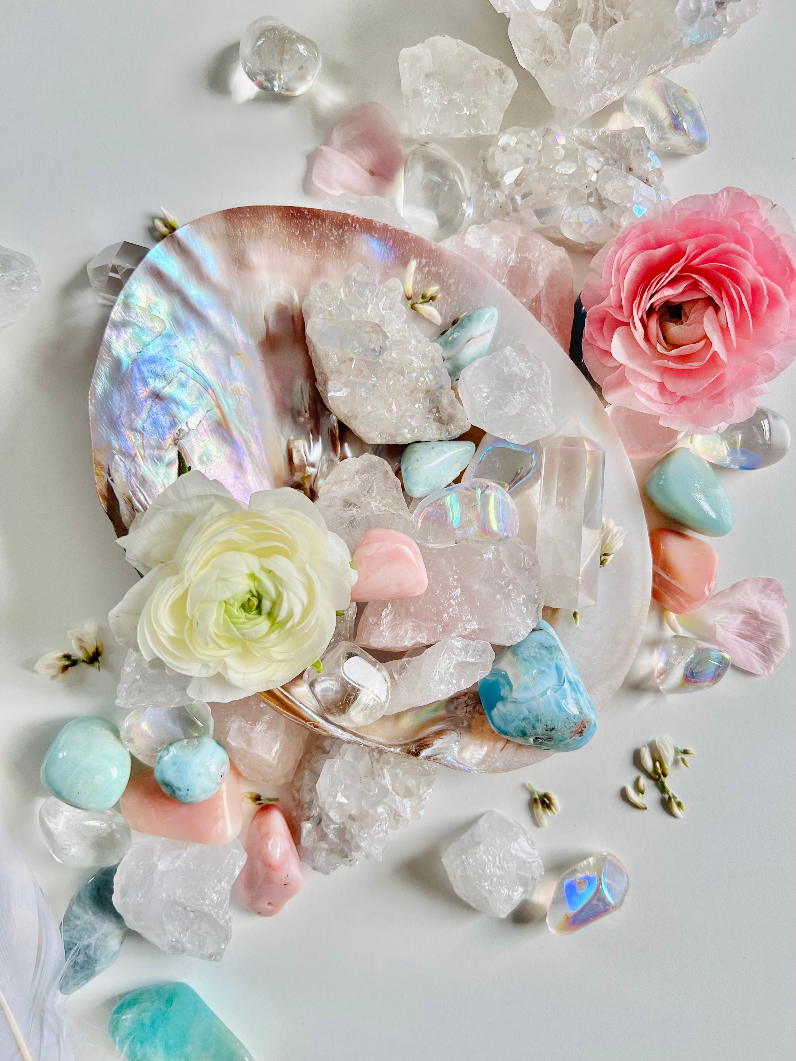 Armband „Lichtbringer“ mit Bergkristall, rosa Andenopal, Magnesit und Süßwasserperlen