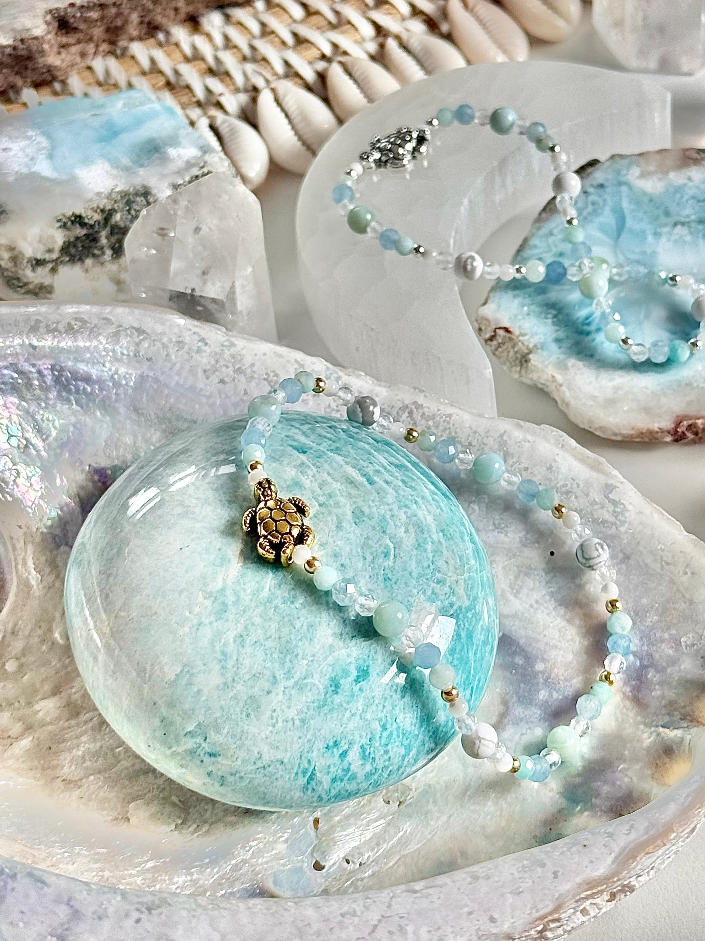 Lemuria Armband mit Angel Aura, Amazonit, Aquamarin, Bergkristall, Larimar und rosa Andenopal