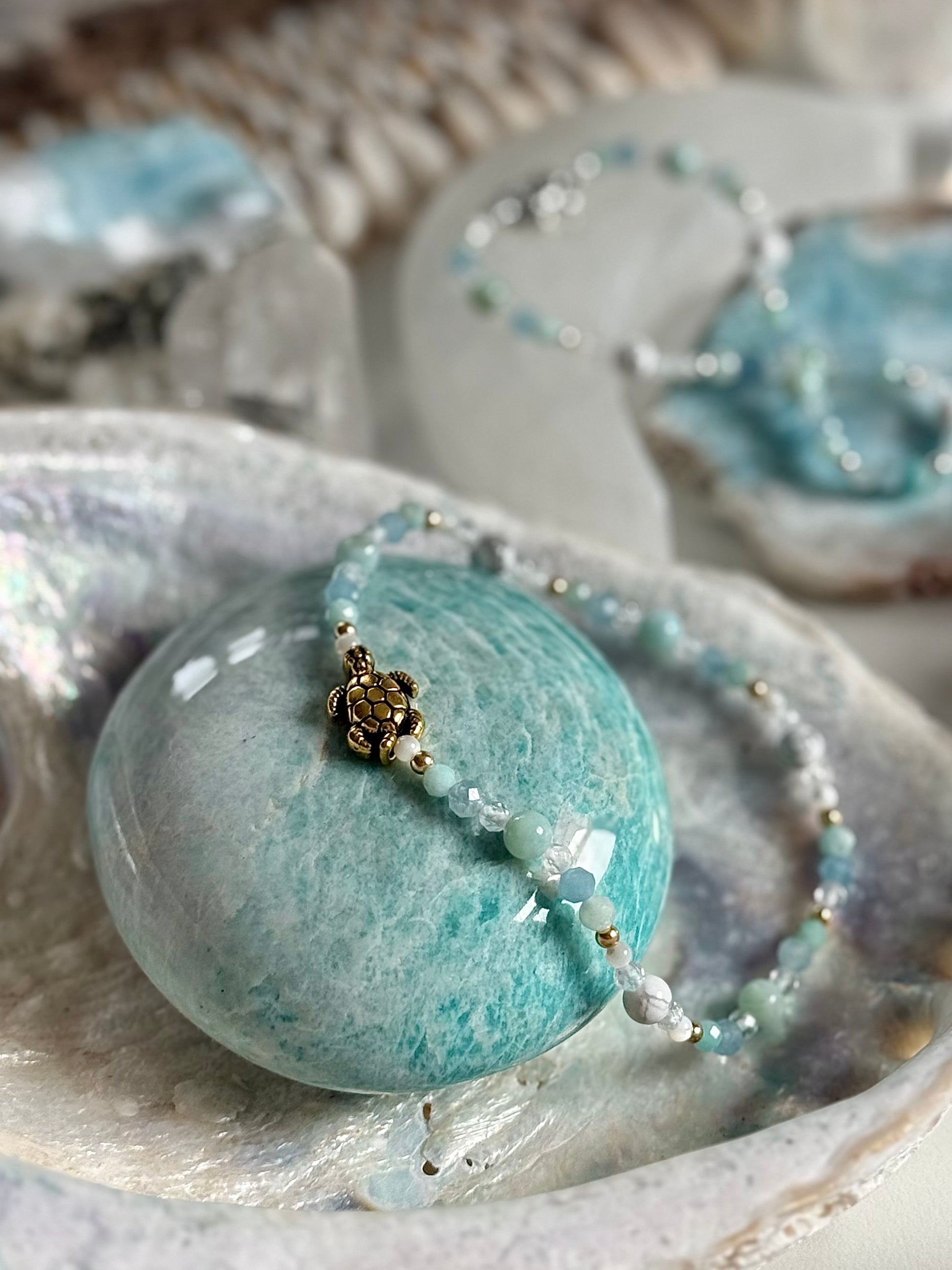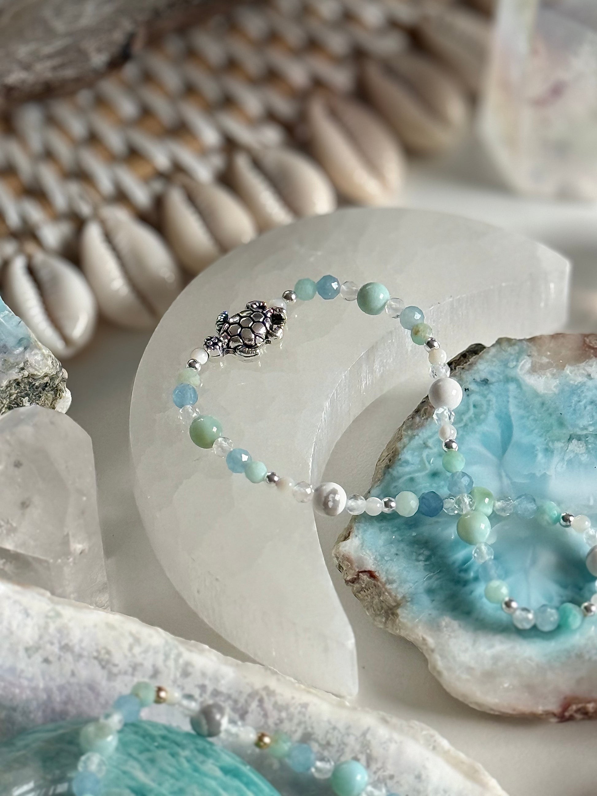 Larimar, das Juwel der Karibik, steht für Gelassenheit, inneren Frieden und das bewusste Loslassen. Amazonit unterstützt Ausgeglichenheit und hilft dabei, auf die eigene innere Stimme zu hören. Aquamarin symbolisiert Leichtigkeit, Vertrauen und den freien Fluss der Gefühle. Bergkristall bringt Klarheit und verstärkt die Energie der anderen Steine. Muschelperlen schenken eine sanfte, feminine Ausstrahlung, während Magnesit für Entspannung, Balance und innere Ruhe steht.