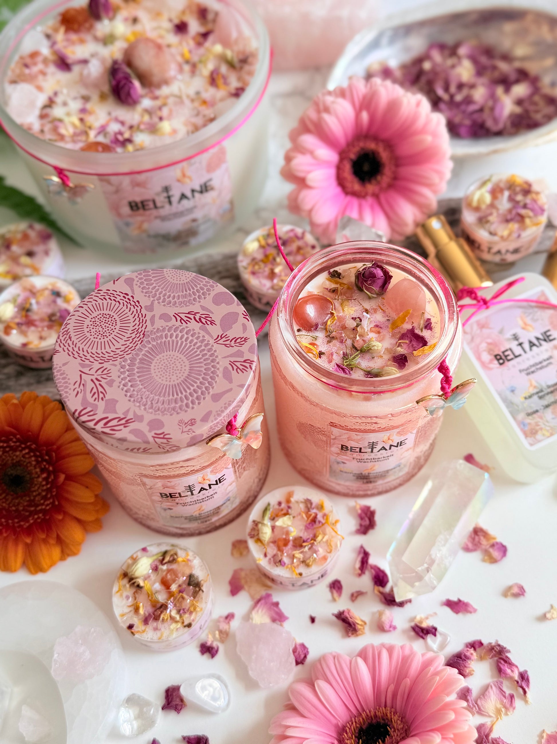 Beltane steht für die aufblühende Energie des Frühlings, für Sinnlichkeit, Fülle und das bewusste Feiern des Lebens. Veredelt mit Rosenblüten, Ringelblume und Jasminblüten trägt sie eine weiche, lebendige Ausstrahlung in sich.