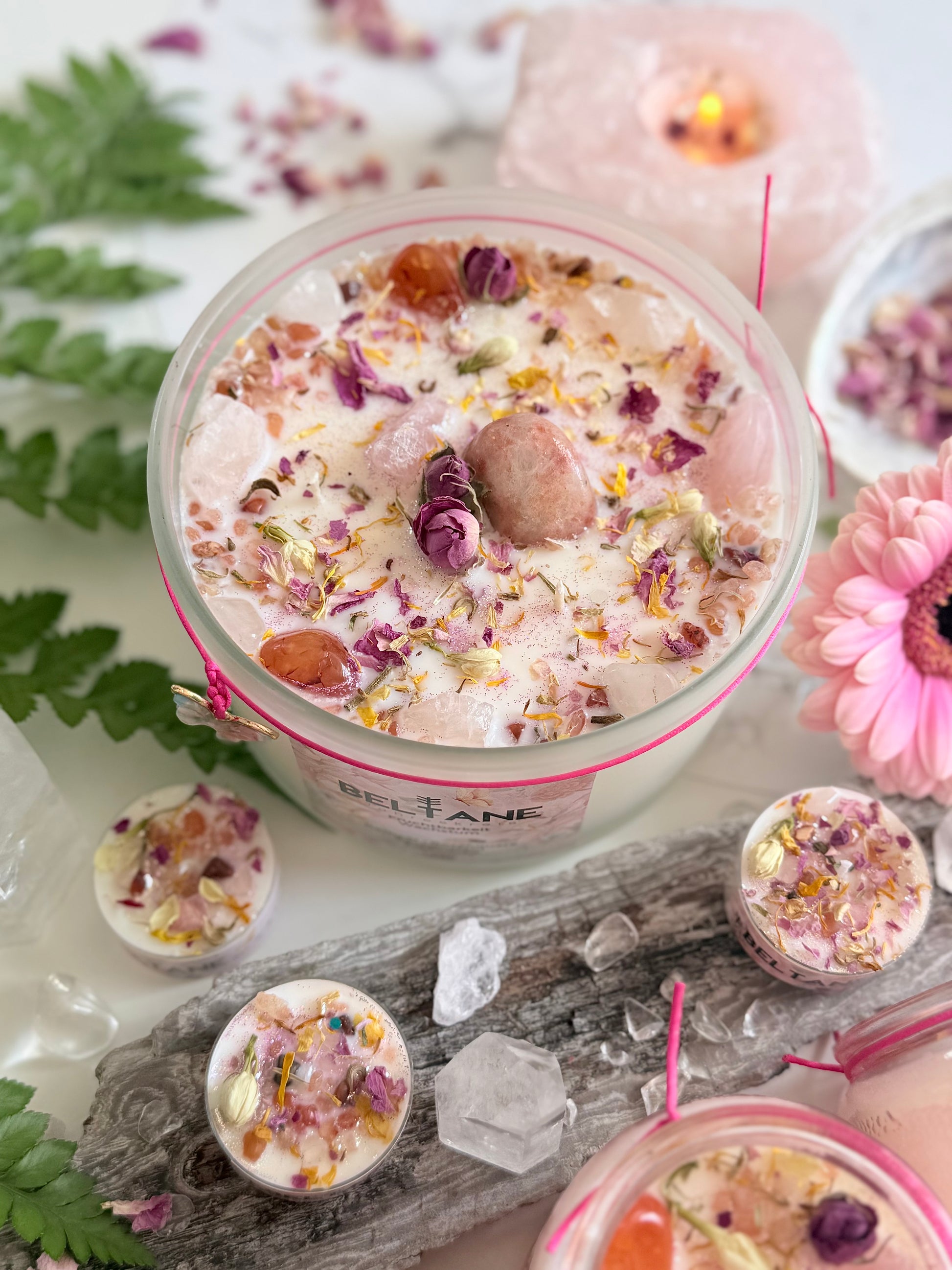 Beltane steht für die aufblühende Energie des Frühlings, für Sinnlichkeit, Fülle und das bewusste Feiern des Lebens. Veredelt mit Rosenblüten, Ringelblume und Jasminblüten trägt sie eine weiche, lebendige Ausstrahlung in sich.
