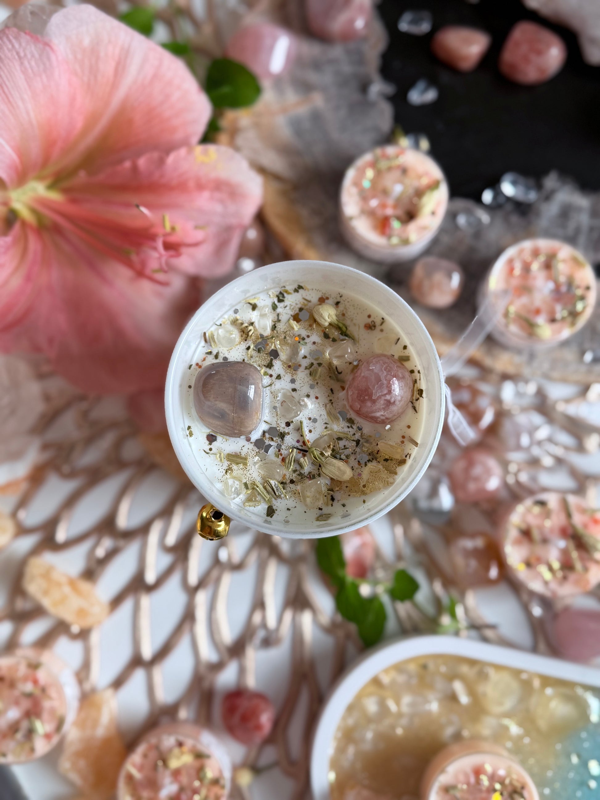 Diese handgegossene Kristallkerze ist dem keltischen Jahreskreisfest Imbolc gewidmet, der Zeit des erwachenden Lichts, des Neubeginns und der sanften Reinigung.