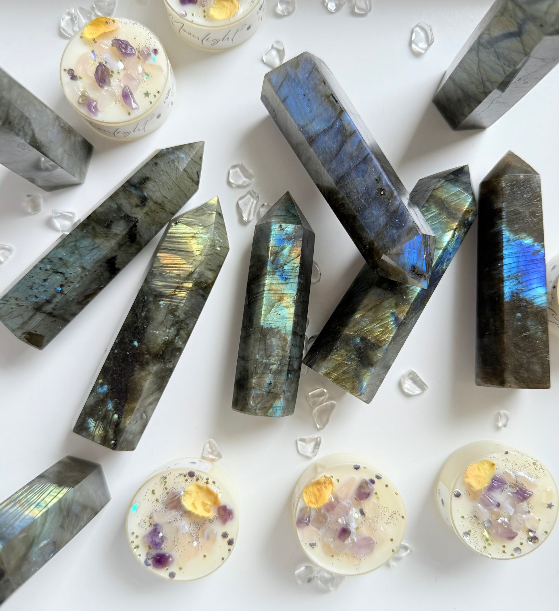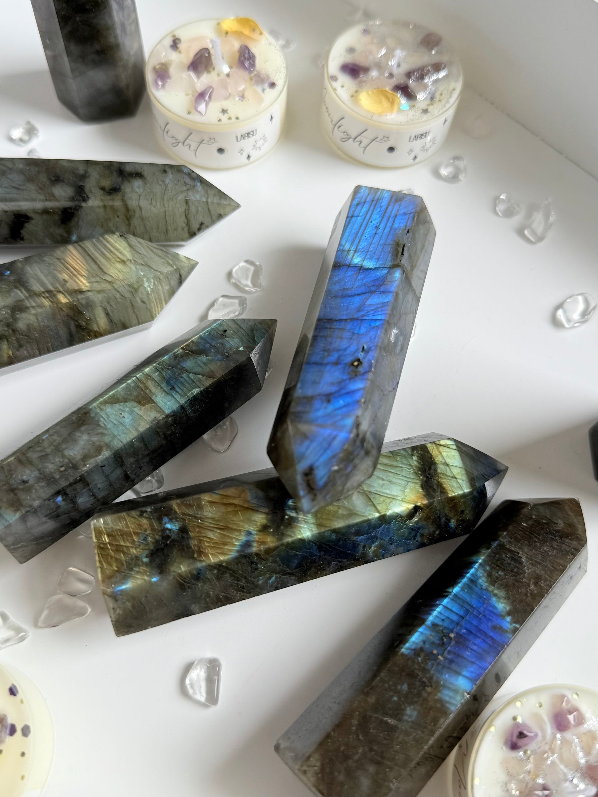 Hübsche Labradorit Spitze, poliert, mit Standfläche. 8cm bis 9,5cm, 1 Stück.